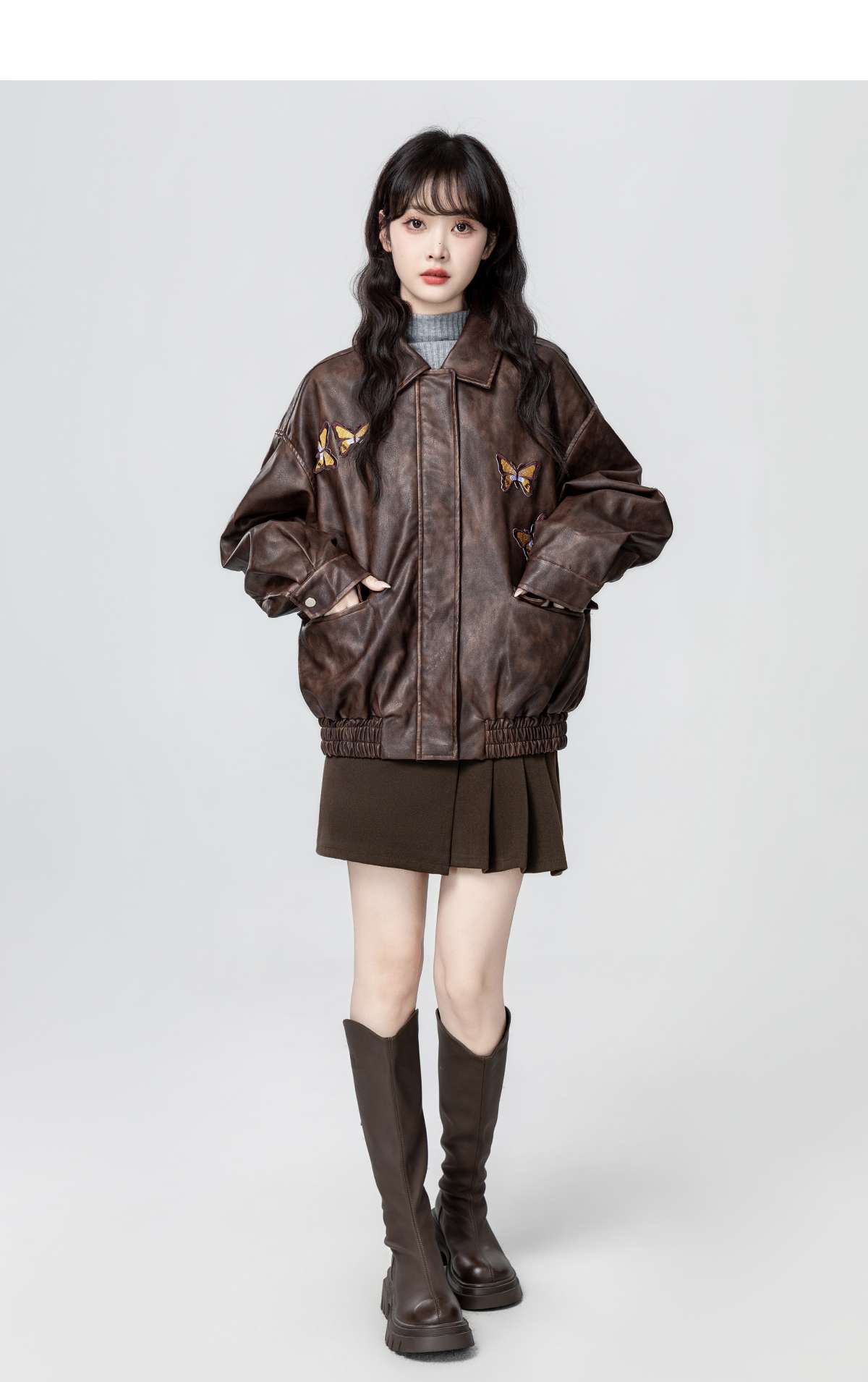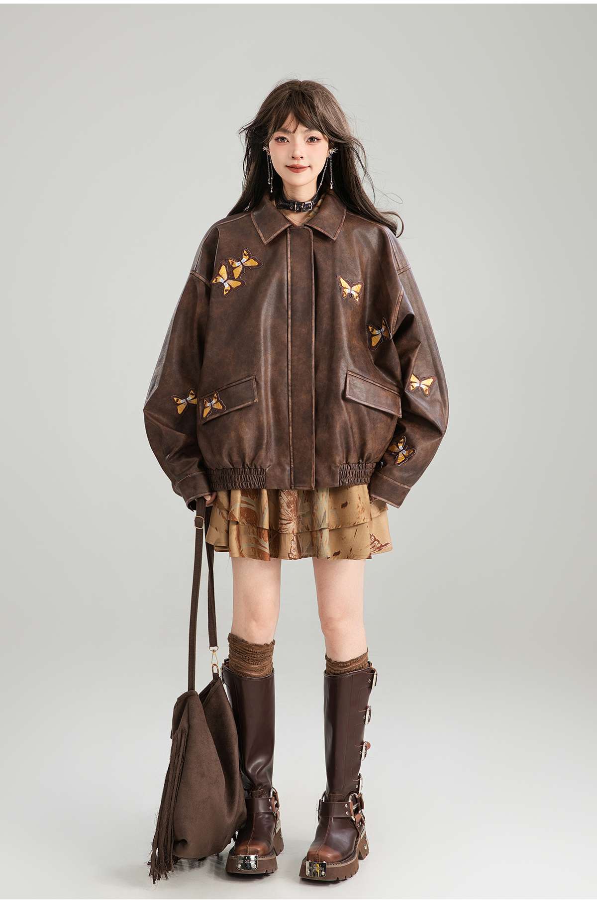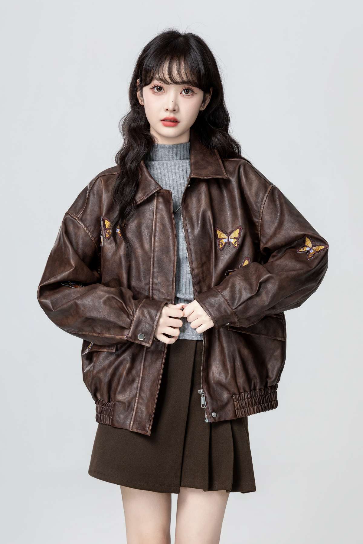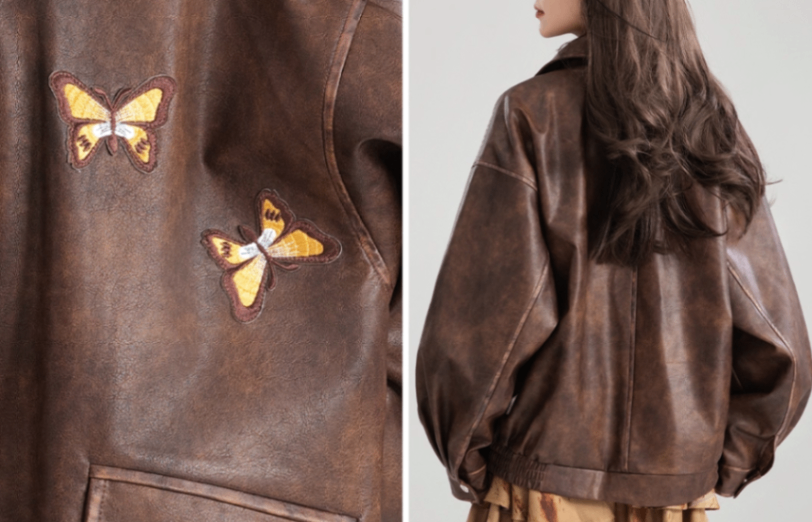 کاپشن چرمی استایل کره ای طرح گلدوزی پروانه ای