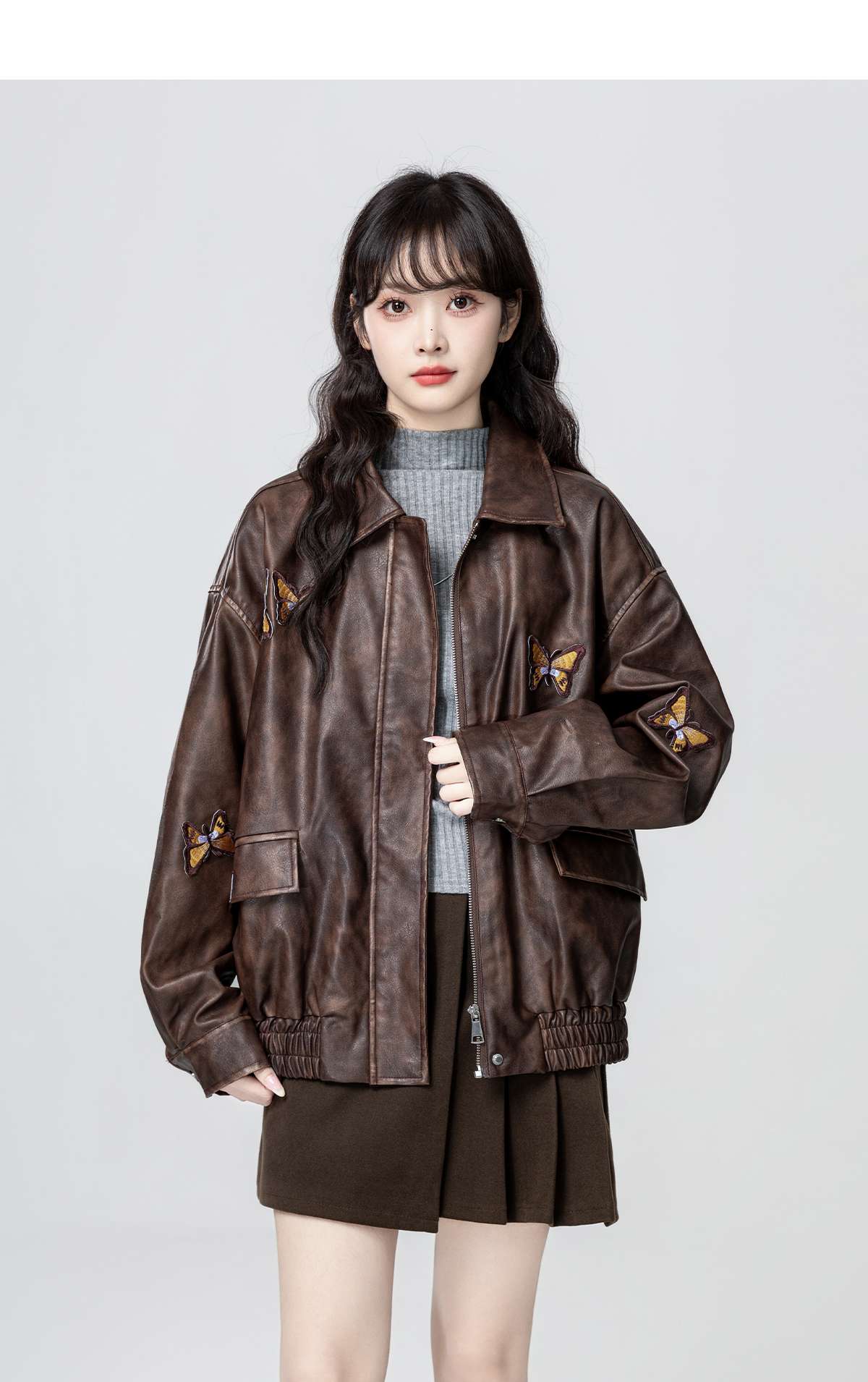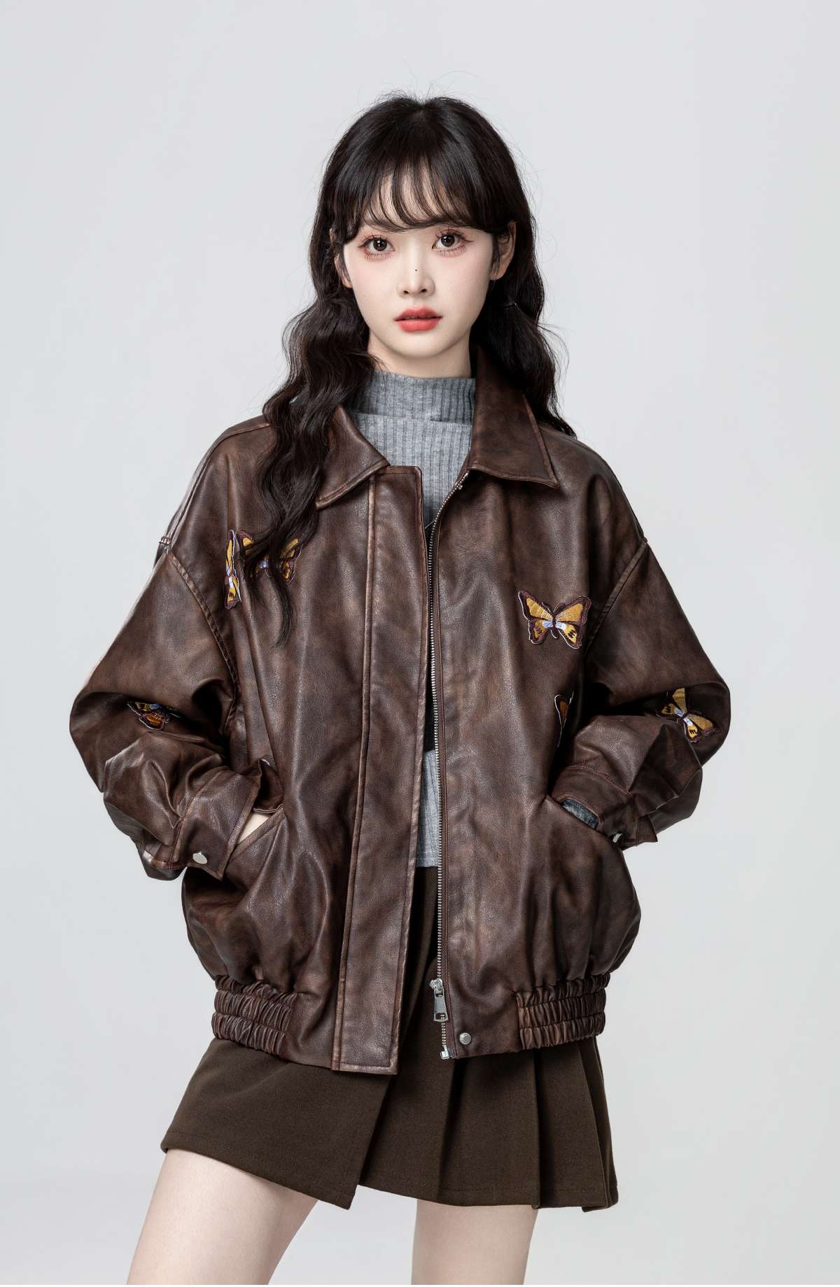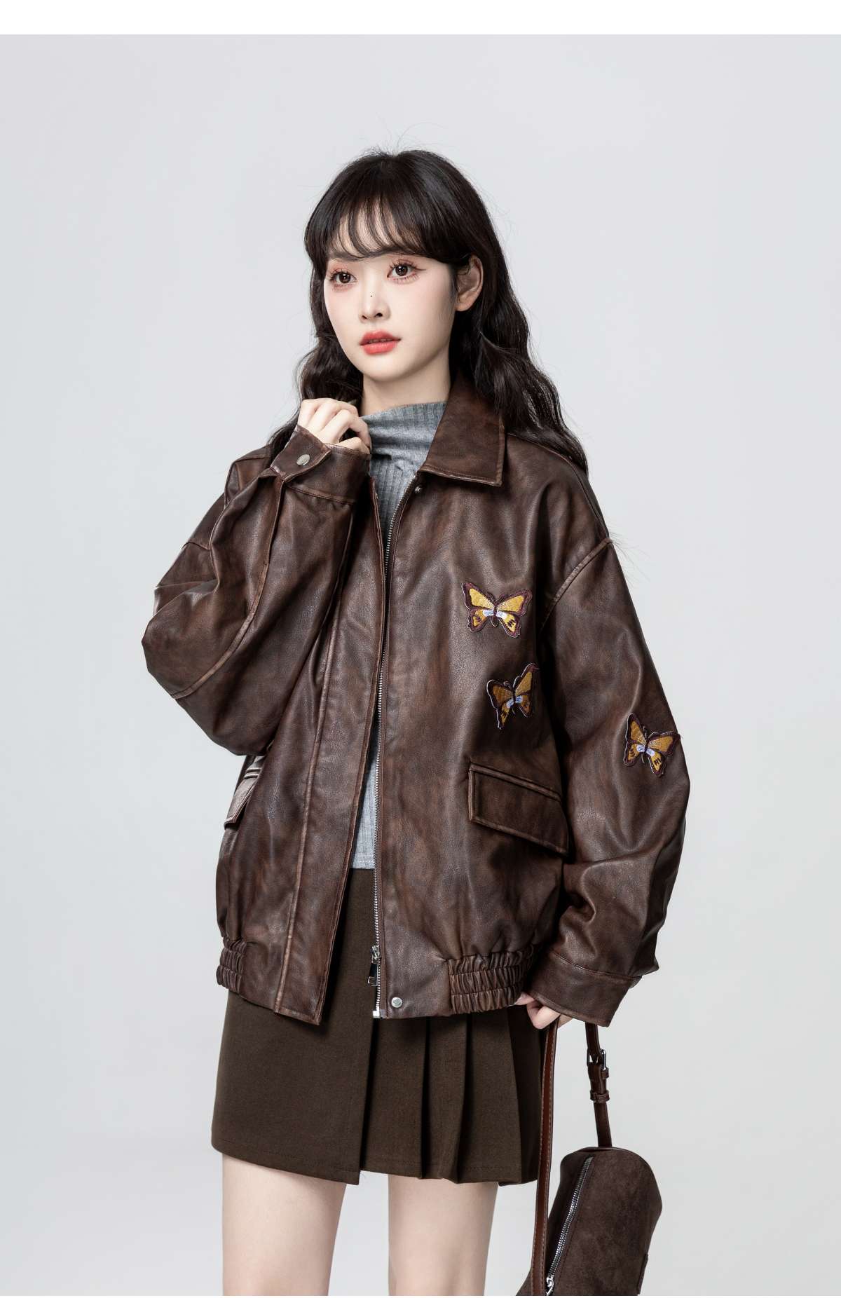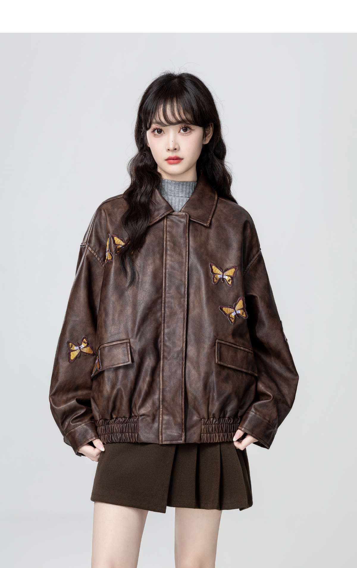 کاپشن چرمی استایل کره ای طرح گلدوزی پروانه ای