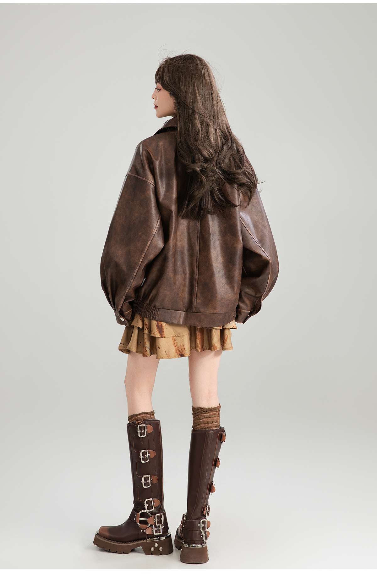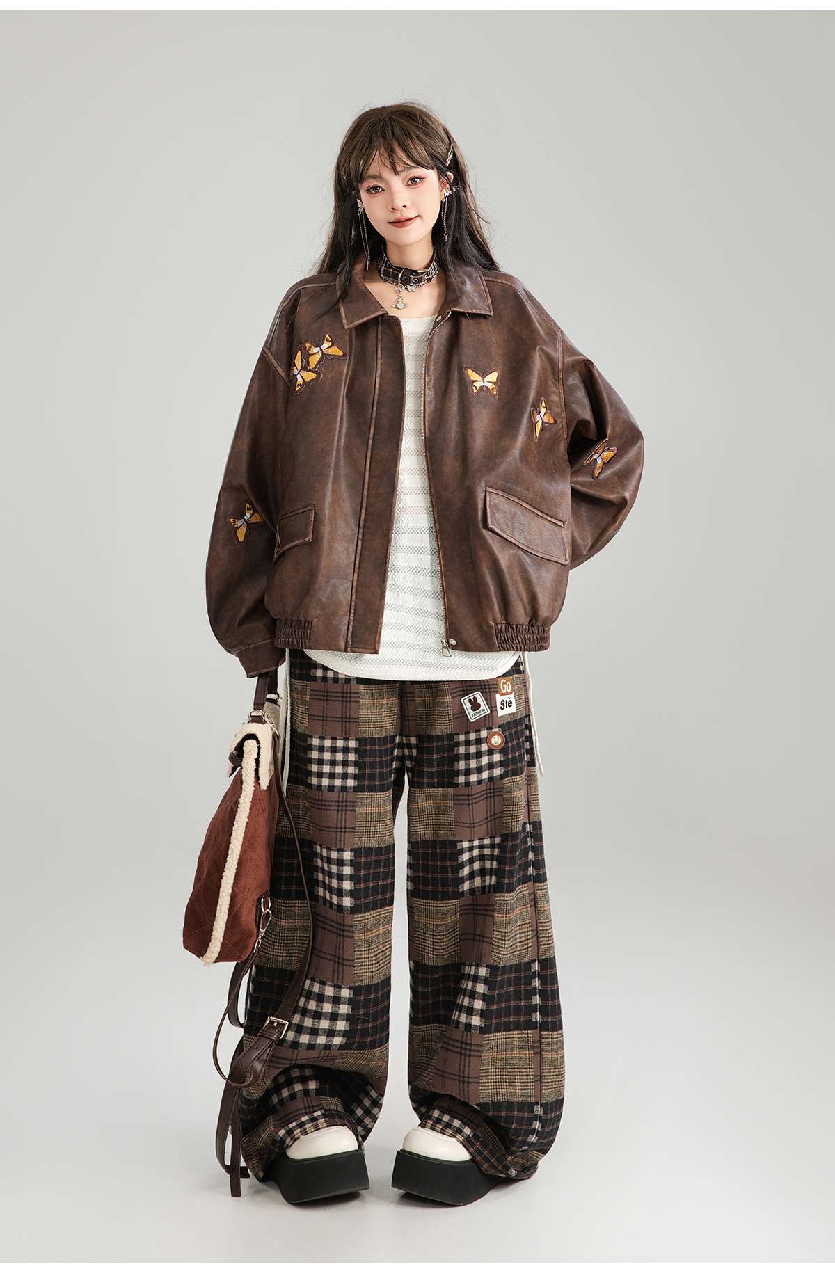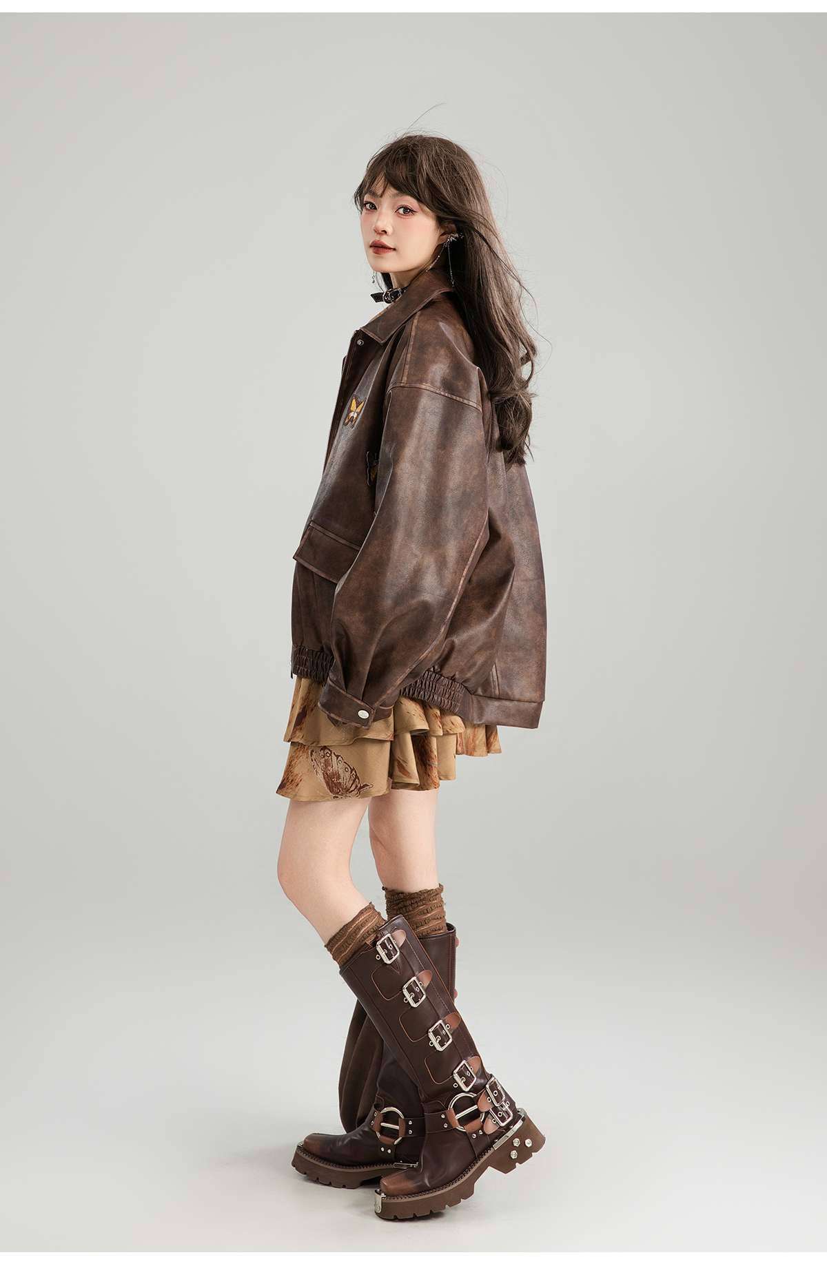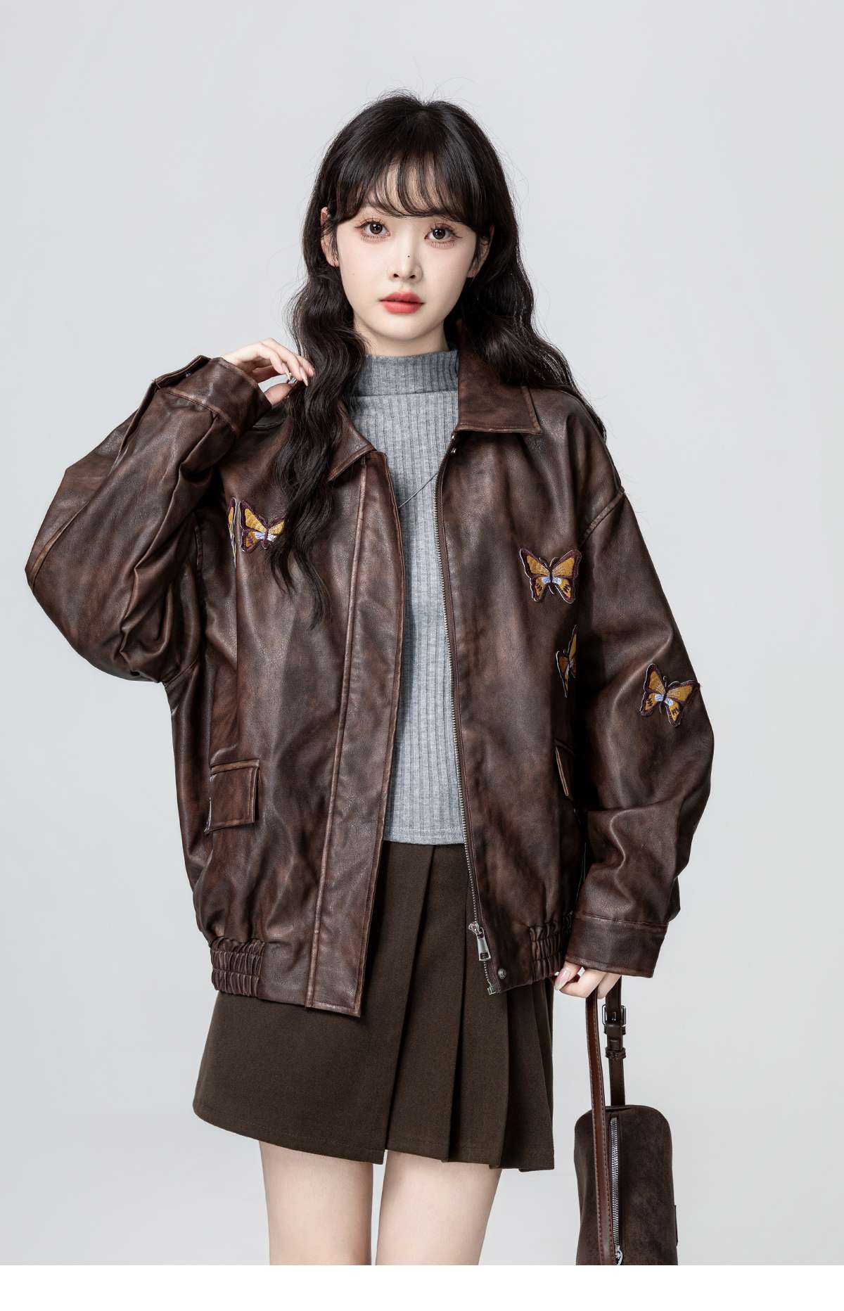 کاپشن چرمی استایل کره ای طرح گلدوزی پروانه ای